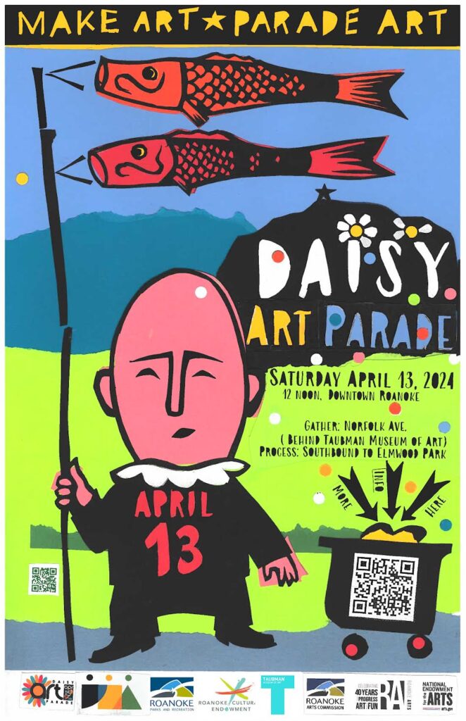 Dear Roanoke Maker Community, we welcome you to a day of art and creativity on April 13th! Daisy Art Parade will be happening right in Downtown Roanoke. MAKERoanoke is planning on being there and so should you! A street parade will start at 12 o’clock sharp and will walk proceed from Norfolk Ave (near Taubman Museum of Art) to Elmwood Park. If you are interested in collaborating with us, please do reach out to us by email or join our Discord! Whether as part of the audience or as part of our Krewe, it would be lovely seeing you there.